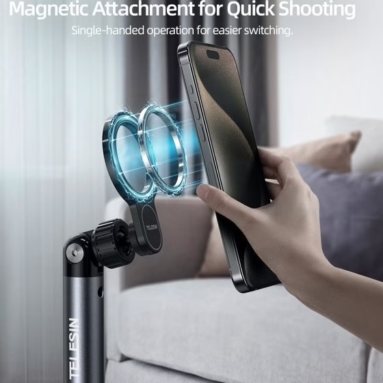 پایه استند Telesin دارای طراحی مغناطیسی است که اجازه میدهد گوشیهوشمند شما بهراحتی و بدون هیچگونه لغزش یا افتادن در جای خود قرار گیرد. این ویژگی باعث میشود که گوشیهوشمند شما ثابت و ایمن بماند حتی در هنگام استفاده از زاویههای مختلف. -